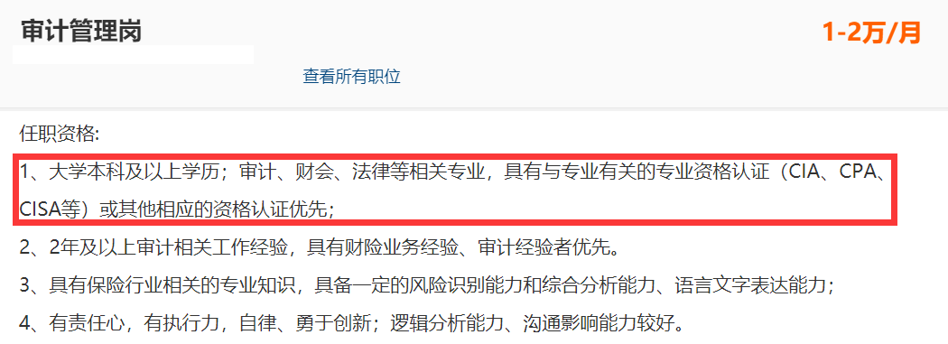 上海市2021年6月发布的上海市重点领域 (金融类) “十四五”紧缺人才开发目录中列出的紧缺程度达两颗星的金融审计人才,明确要求需要具有CISA。